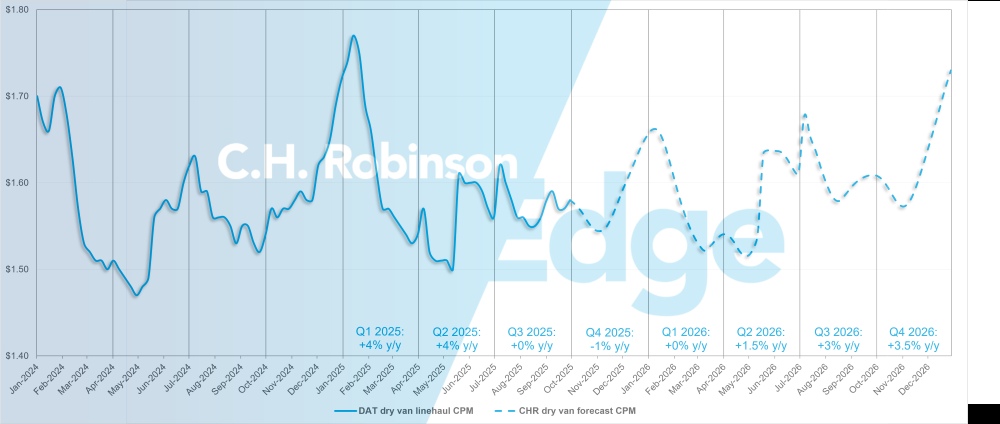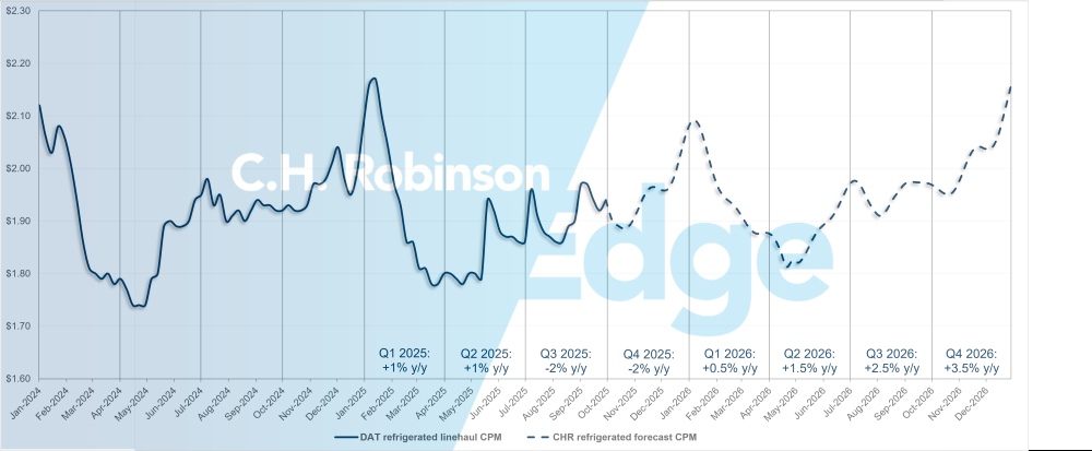 The C.H. Robinson 2025 refrigerated van cost per mile forecast remains at -1% y/y, while the 2026 forecast remains at +2% y/y.