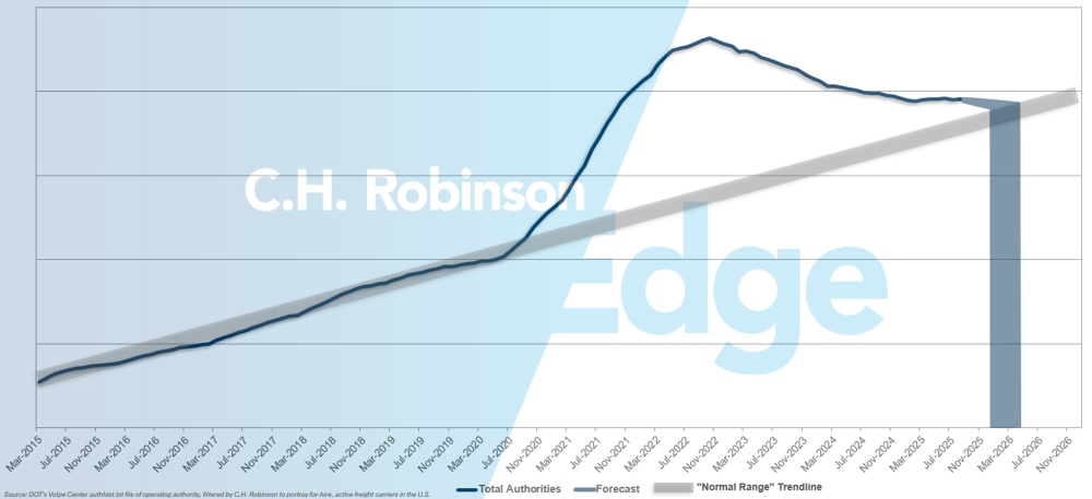 Each month, carriers continue to close due to the challenging freight environment. This has been mostly balanced out by the number of new entrants into the market. The net effect is a slowly decreasing carrier population. If the current pace of U.S. carrier attrition continues, carrier authority counts would return to historical levels in early 2026, possibly later.