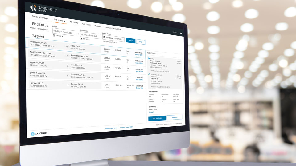 Begin your search by viewing thousands of available loads—more than any other provider in North America—directly on the C.H. Robinson load board within Navisphere Carrier.
