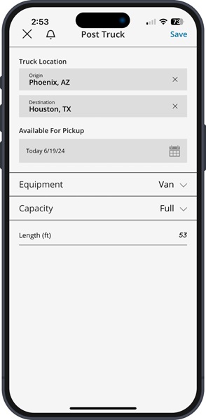 Click or tap the “Post Truck” button to start a new posting. Fill in the required details about your truck. The typical information you need to provide includes origin and destination, truck type (e.g., Dry Van, Reefer, Flatbed), trailer information, and dates. Once complete, click or tap “Post Truck”.