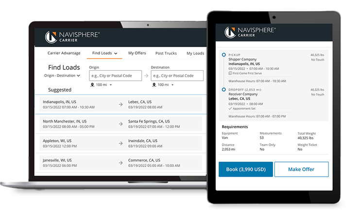 Crea una cuenta Navisphere® Carrier para comenzar a reservar cargas. Diseñado para transportistas de todos los tamaños, Navisphere Carrier facilita el transporte de las cargas que desea, desde la reserva instantánea hasta las cargas recomendadas.