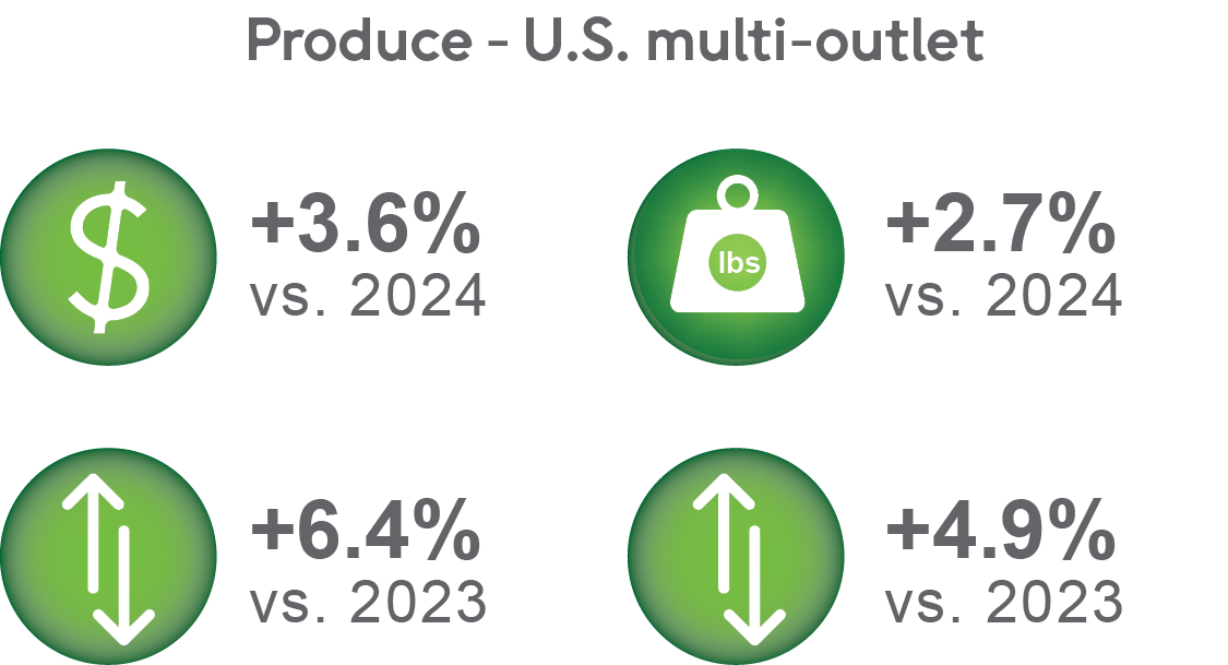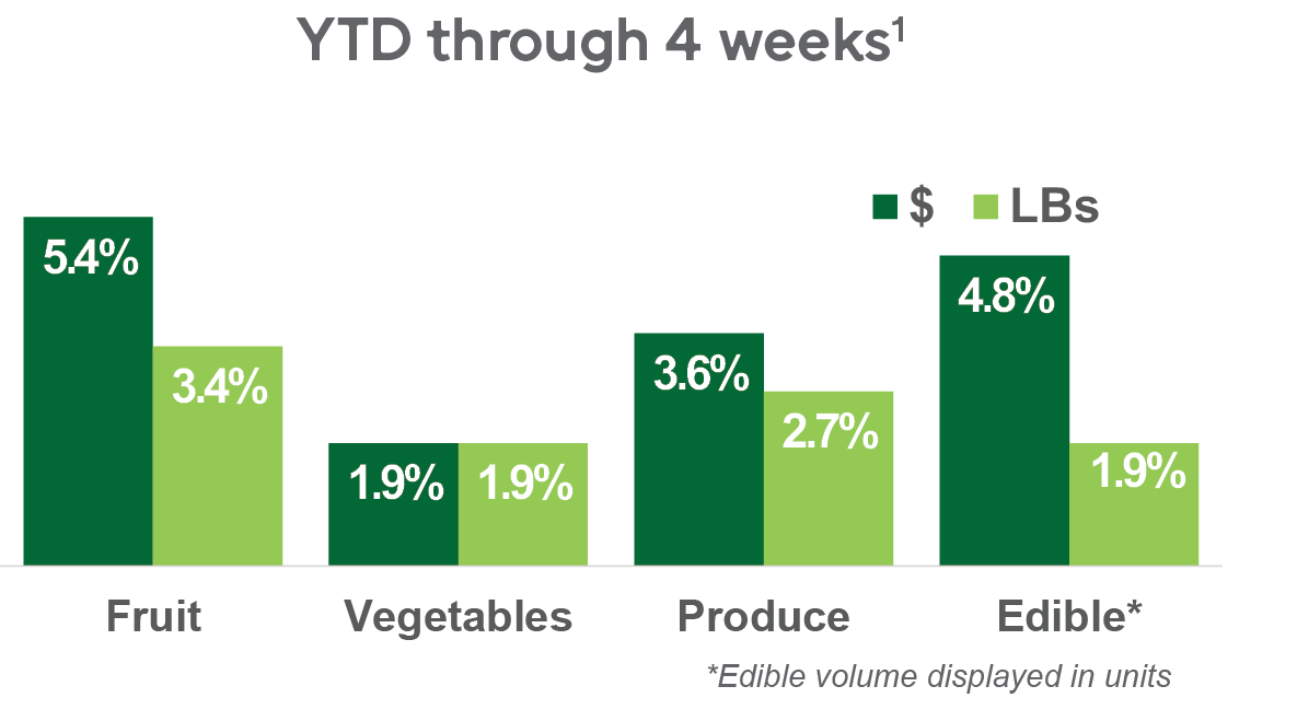 • Through the first four weeks, produce dollars grew 3.6%, while volume sales are trending up 2.7% vs 2024.