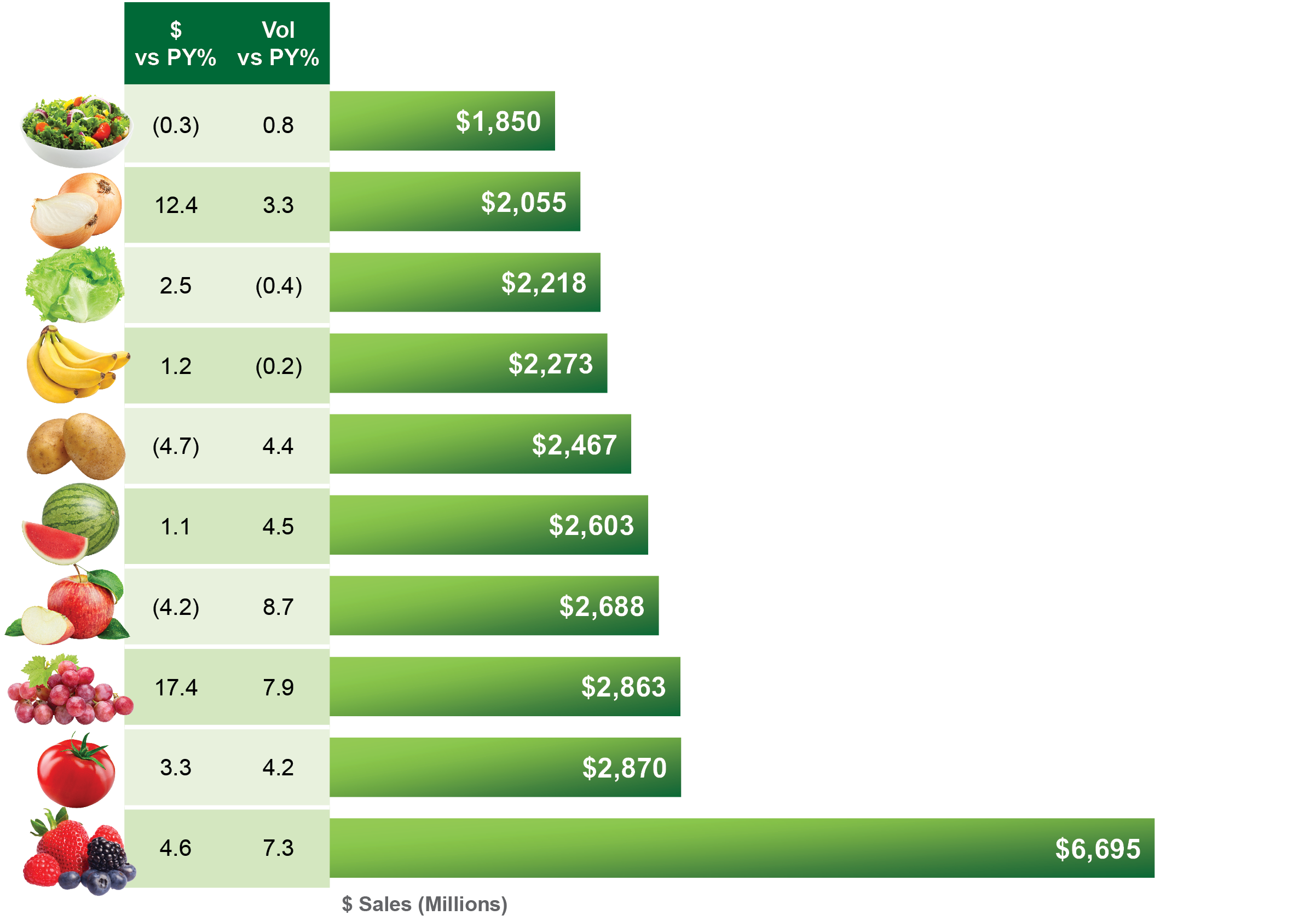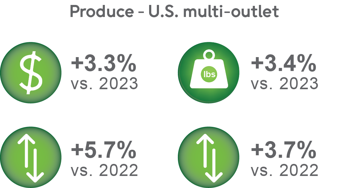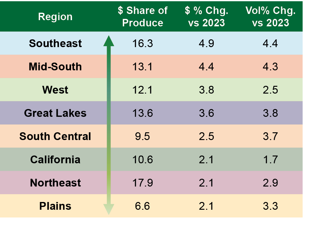 Produce has seen positive dollar and volume sales growth across all defined regions.